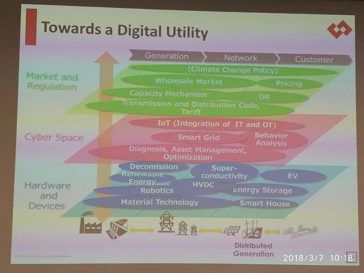邁向數(shù)字化的公用事業(yè)。最下層是硬件和設(shè)備;中間層是賽博空間,包括IoT(IT和OT)的集成,智能電網(wǎng),行為分析,資產(chǎn)管理等;最上層是市場(chǎng)和管制。
