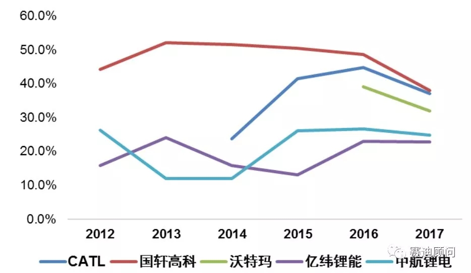 現(xiàn)階段電池車廠商受制于上游材料和下游車企。一方面,由于上游礦石漲價,目前主要電池材料的價格均出現(xiàn)了上漲,電池廠商成本上升。另一方面,因補(bǔ)貼下降,電動汽車廠商為控制成本,壓縮電池價格。這導(dǎo)致主要電池車廠商毛利率在2016、2017年呈下降趨勢,目前毛利率平均在30%及以下,不同廠商間利潤亦呈現(xiàn)分化趨勢。