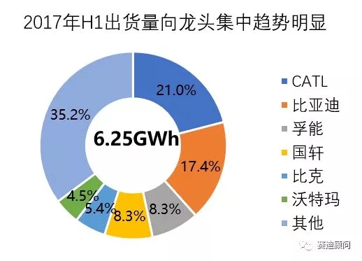 同時,大型電池廠商為提高市場份額,降低風(fēng)險,正在積極與車企合作,也逐漸導(dǎo)致了多寡頭的格局。除了比亞迪采用自配套模式外,車企與電池廠商多以合資或外購模式進(jìn)行綁定。2017年電池的出貨量較2016年,也逐漸向龍頭集中,排名前六的電池廠商總的出貨量占比超過60%。