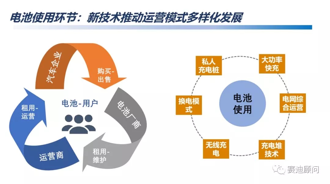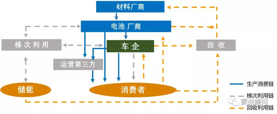 由材料廠商到電池廠商、車企到消費(fèi)者的傳統(tǒng)產(chǎn)業(yè)鏈,由于商業(yè)模式的創(chuàng)新,電池廠商、車企和運(yùn)營第三方都可接觸到消費(fèi)者,也均可實現(xiàn)對電池使用最終環(huán)節(jié)的運(yùn)營。