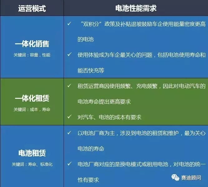 在多樣化的運(yùn)營模式和使用場景對電池性能也提出了不同要求。一體化銷售的運(yùn)營模式以車企主導(dǎo)為特點(diǎn),更關(guān)注電池的容量和性能;一體化租賃則以第三方運(yùn)營商主導(dǎo),對電池成本和壽命提出了更高要求;電池租賃以電池廠商為主導(dǎo),要求電池的壽命更長、一致性和標(biāo)準(zhǔn)化程度更高。