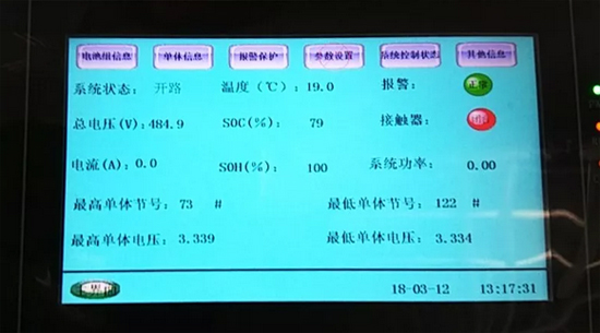 該系統(tǒng)由144個120Ah電芯串聯(lián)而成,配備可視化的人機操作界面。系統(tǒng)有離網(wǎng)和并網(wǎng)兩種工作模式,并離網(wǎng)轉換時間≤80ms,轉換過程不會影響用戶的正常用電需求。其電池管理系統(tǒng)具有信息采集、判斷、處置功能,可對電芯電壓、溫度、電流等進行有效管理。