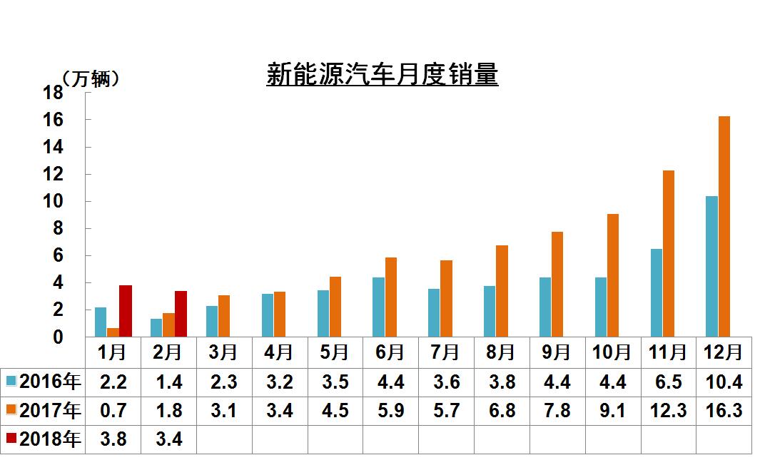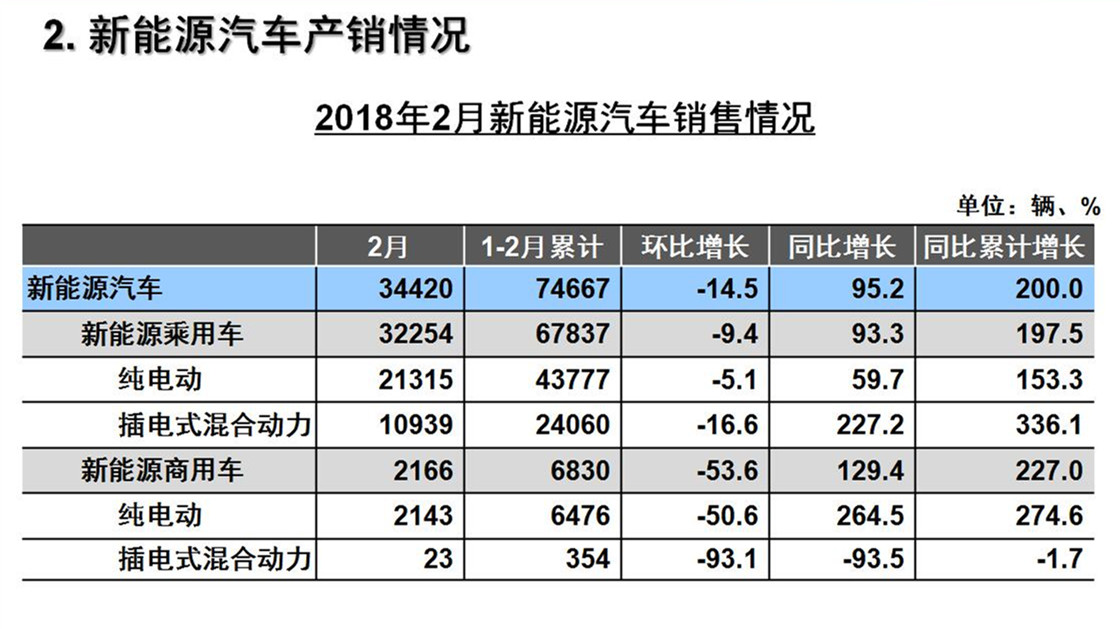 2月,新能源汽車產銷分別為39230輛和34420輛,同比分別增長119.1%和95.2%。1-2月,新能源汽車生產81855輛,銷售74667輛,同比分別增長225.5%和200%。