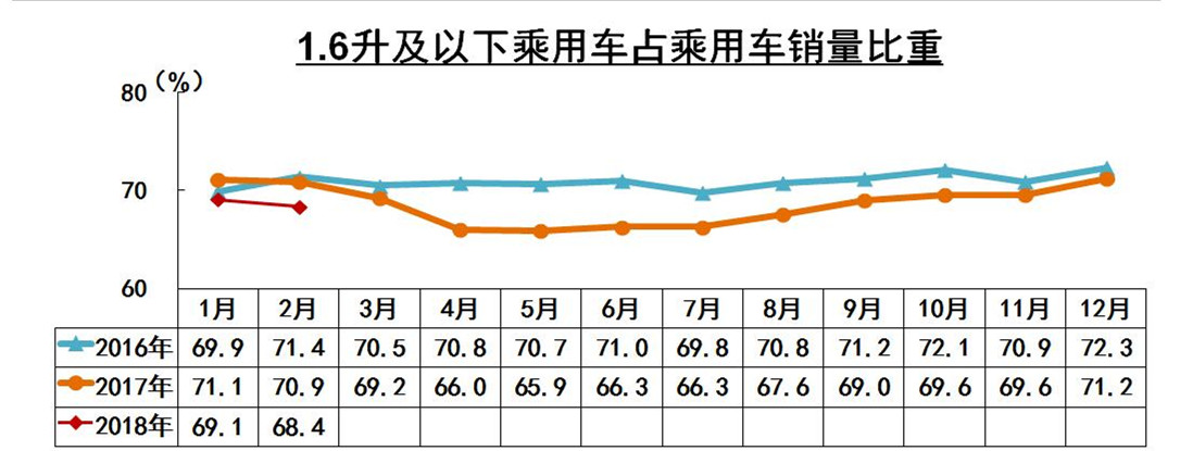 值得關注的是, 2月份1.6升及以下乘用車銷售100.9萬輛,同比下降12.4%,占乘用車銷量比重為68.4%,同比下降2.2個百分點。1~2月,1.6升及以下乘用車銷售270.6萬輛,同比下降0.8%,占乘用車銷量比重為68.3%,同比下降2個百分點。1.6升及以下中國品牌乘用車銷售143萬輛,同比增長2.7%。