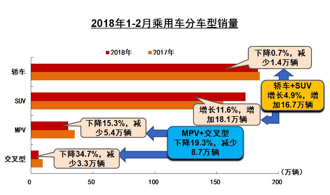 在整體增速下滑的市場中,部分車型下降的更嚴重,尤其是交叉型乘用車。1~2月產銷同比分別下降41.9%和34.7%。