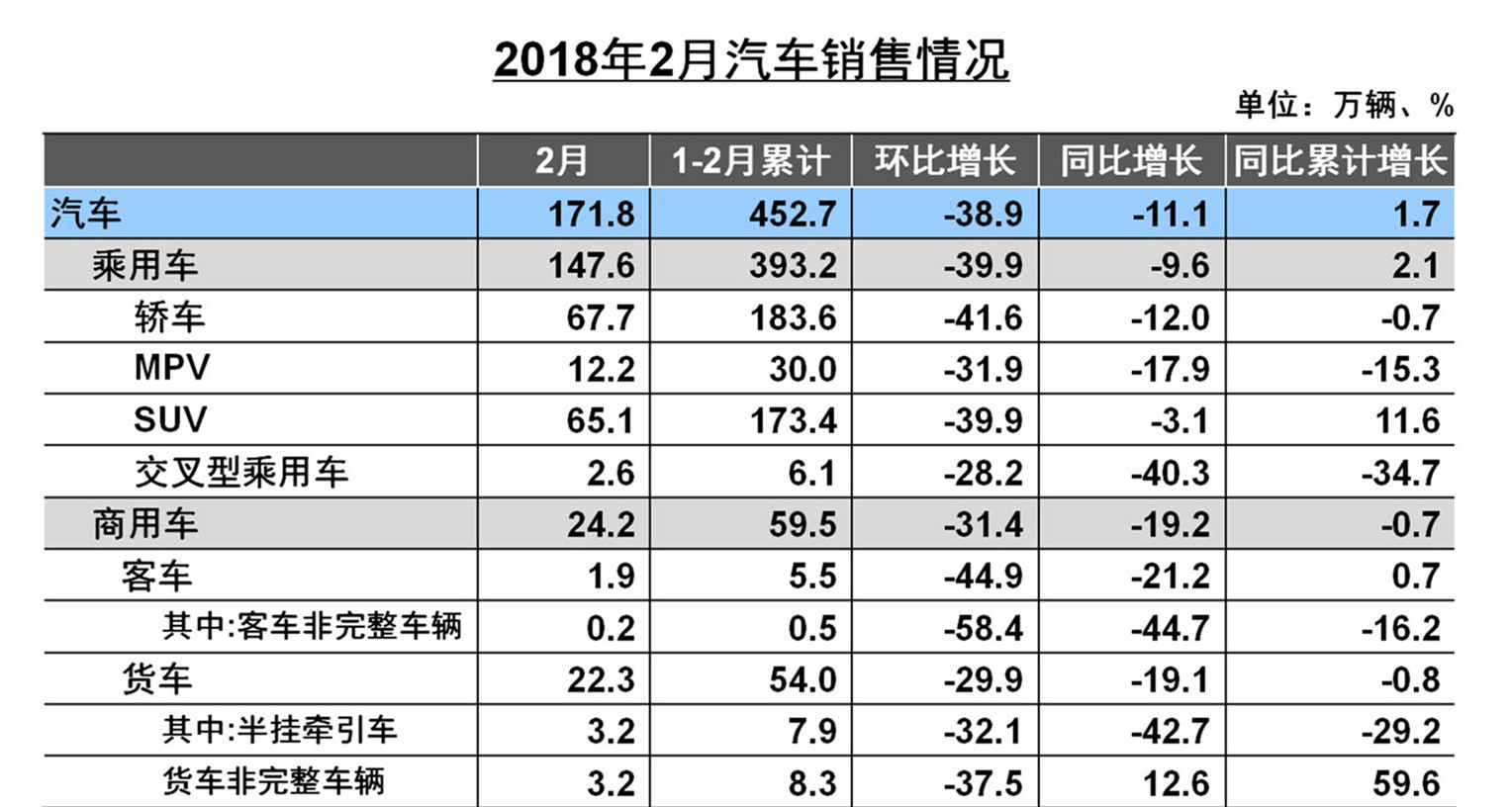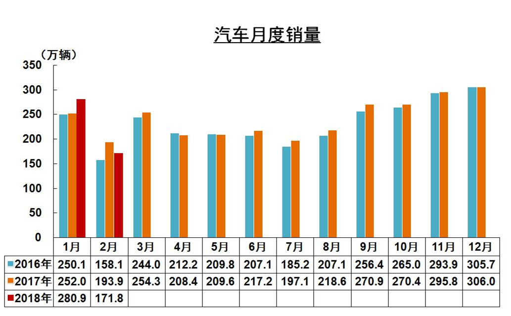 2月,汽車產銷分別為170.6萬輛和171.8萬輛,環(huán)比分別下降36.6%和38.9%,同比分別下降20.8%和11.1%。
