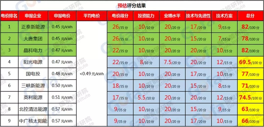 從項(xiàng)目4預(yù)估評(píng)分結(jié)果來(lái)看,信義玻璃、中廣核、華能、國(guó)電投等四家企業(yè)較有優(yōu)勢(shì)。其中“電價(jià)得分”并不占優(yōu)勢(shì)的制造型企業(yè)信義玻璃,將有可能通過(guò)技術(shù)先進(jìn)性與技術(shù)方案兩項(xiàng)得分戰(zhàn)勝此標(biāo)段最低電價(jià)華能集團(tuán)。