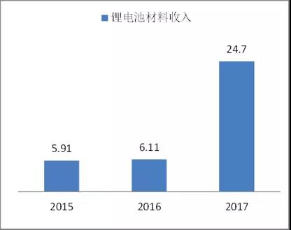 數(shù)據(jù)顯示,2015-2017年,寧德時(shí)代鋰電池材料收入分別為5.91億元、6.11億元和24.7億元。分別占據(jù)總營(yíng)收的10.44%、4.18%和12.91%。