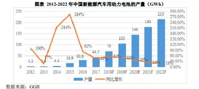 2017 年中國(guó)新能源汽車銷量 77.7 萬(wàn)輛,同比增長(zhǎng) 53.25%,連續(xù)三年位居全球最大的新能源汽車產(chǎn)銷市場(chǎng)。這一年中國(guó)汽車動(dòng)力鋰電池產(chǎn)量為44.5GWh,同比增長(zhǎng) 44.5%。高工產(chǎn)研鋰電研究所GGII預(yù)計(jì)到2022 年中國(guó)汽車動(dòng)力鋰電池產(chǎn)量將達(dá)到 215GWh,同比 2017 年增長(zhǎng) 3.8倍。