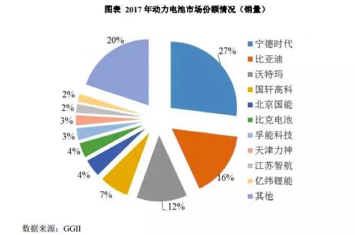 從銷量來(lái)看,2015 年、2016 年和 2017年,寧德時(shí)代動(dòng)力電池系統(tǒng)銷量分別為 2.19GWh、6.80GWh 和 11.84GWh,根據(jù)高工產(chǎn)研鋰電研究所GGII 統(tǒng)計(jì),公司動(dòng)力電池系統(tǒng)銷量連續(xù)三年在全球動(dòng)力電池企業(yè)中排名前三位,2017年銷量排名全球第一,超越老牌電池巨頭松下。而在中國(guó)市場(chǎng)上,去年寧德所占市場(chǎng)份額為27%,約為三分之一。