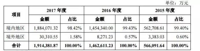 目前動(dòng)力電池系統(tǒng)銷售仍是寧德時(shí)代的主要收入來(lái)源,近三年其動(dòng)力電池系統(tǒng)銷售收入分別49.81億、139.76億、166.57億,占主營(yíng)業(yè)務(wù)收入的比例分別為87.98%、95.55%和 87.01%。從區(qū)域來(lái)看,海外市場(chǎng)份額由0.60%提升至1.58%。