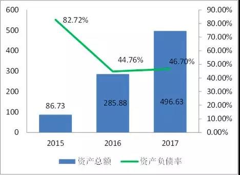 三年來(lái),公司資產(chǎn)總額從 86.73 億元增長(zhǎng)至496.63 億元,資產(chǎn)負(fù)債率從82.82%下降至46.70%。