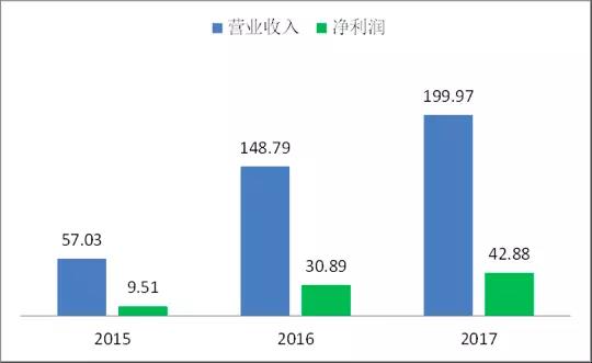2015 年、2016 年及 2017 年,寧德時(shí)代營(yíng)業(yè)收入分別為 57.03 億元、148.79億元及 199.97 億元,年均復(fù)合增長(zhǎng)率 87.26%;凈利潤(rùn)分別9.51 億元、30.89 億元及 42.88 億元,年均復(fù)合增長(zhǎng)率高112.39%。