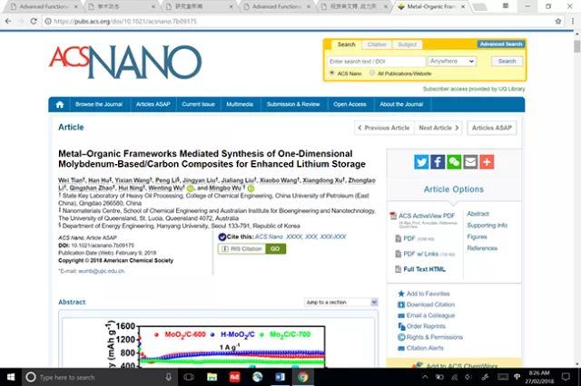 近日,美國(guó)化學(xué)學(xué)會(huì)旗艦期刊ACS Nano刊發(fā)我校重質(zhì)油國(guó)家重點(diǎn)實(shí)驗(yàn)室吳明鉑團(tuán)隊(duì)在碳基復(fù)合儲(chǔ)能材料領(lǐng)域的最新研究成果“Metal-Organic Frameworks Mediated Synthesis of One-Dimensional Molybdenum-Based/Carbon Composites for Enhanced Lithium Storage”(金屬有機(jī)框架材料輔助合成高儲(chǔ)鋰性能的一維鉬基化合物/碳復(fù)合材料)。該成果提出一種新型構(gòu)筑高性能碳基復(fù)合儲(chǔ)能材料的方法,對(duì)設(shè)計(jì)合成新一代電池電極材料具有重要指導(dǎo)意義和參考價(jià)值。我?;瘜W(xué)工程與技術(shù)專業(yè)2015級(jí)碩士研究生田巍為第一作者,吳明鉑教授為通訊作者,中國(guó)石油大學(xué)(華東)為第一署名單位。