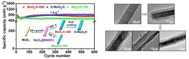 審稿專家對(duì)該研究成果給予高度評(píng)價(jià),認(rèn)為金屬有機(jī)框架材料輔助合成高儲(chǔ)鋰性能一維鉬基化合物/碳復(fù)合材料的方法對(duì)多維度碳材料的可控制備及過(guò)渡金屬化合物/碳基復(fù)合材料的合成具有重要意義,在碳材料構(gòu)筑和儲(chǔ)能應(yīng)用方面將會(huì)引起廣泛關(guān)注。