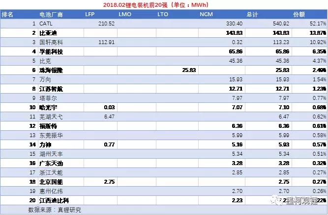 上表是前兩個月累計裝機20強榜單。從上表可以看到,CATL以1.2GWh占據(jù)了一半的市場份額。比亞迪以258.4MWh占比10.98%排名第二,較1月排名前進一名。國軒高科以242.98 MWh占比10.32%排在第三位,較1月下降一名。第四名孚能科技以138MWh占比5.86%,第五名比克的累計裝機量不到70MWh,不足孚能科技的一半。塔菲爾進展迅速,去年底才實現(xiàn)裝機,目前已在排行榜位居第18位。雖然前兩個月的裝機數(shù)據(jù)不能說明什么,但總體感覺電池廠商的兩極分化有加劇的跡象。