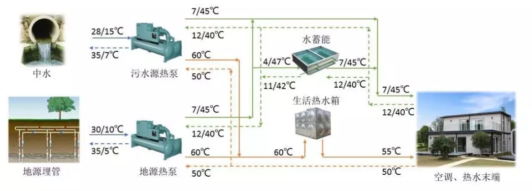 在上圖的園區(qū)中利用了地源熱泵,中水、污水源熱泵給末端進(jìn)行供冷、供暖,同時(shí)融合了水蓄能的裝置。
