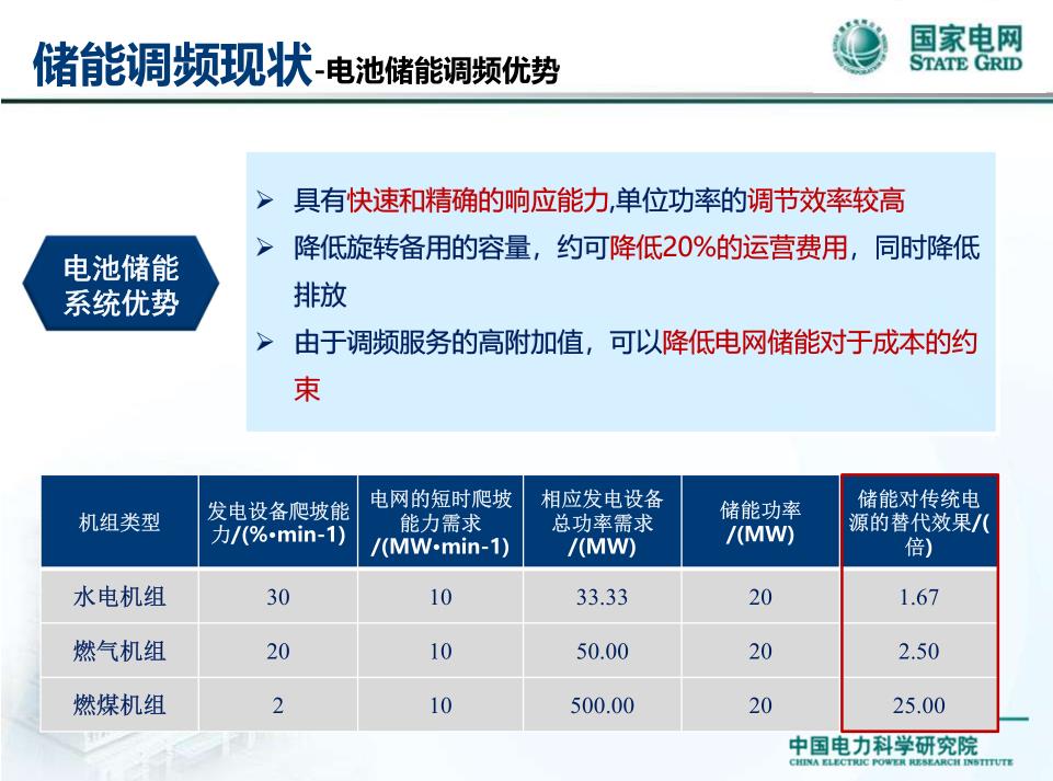 我們看一個(gè)周期之內(nèi),你跟這個(gè)指令怎么樣,這是我調(diào)頻指令下來之后,你跟不跟得上,你看這個(gè)誤差、延遲經(jīng)常有,所以,火電調(diào)頻確實(shí)實(shí)實(shí)在在地碰到了相應(yīng)的問題,急需找一種方法去提升。這個(gè)時(shí)候,儲能就應(yīng)運(yùn)而生。儲能最大的優(yōu)點(diǎn),響應(yīng)時(shí)間是百毫秒級,很快。大家可以看出,這是儲能的指令,我跟你幾乎都能跟得上,所以儲能參與調(diào)頻的好處是:精度高、速度快,各方面都很強(qiáng)。有國內(nèi)的學(xué)者對儲能調(diào)頻能力進(jìn)行了量化,現(xiàn)在業(yè)界有這么兩種說法:一種是“儲能的調(diào)頻能力相當(dāng)于常規(guī)火電機(jī)組的25倍”;還有一種說法是“儲能的調(diào)頻能力相當(dāng)于常規(guī)火電機(jī)組的17倍”。我個(gè)人建議是中間值,25倍可能有點(diǎn)過了。從這個(gè)道理上講,就把儲能參與調(diào)頻的基本原理告訴給大家了,比如讓一個(gè)人從五樓直接跳到一樓肯定不行,有儲能在的話,搞一堆臺階,慢慢下來就沒事。所以有儲能在以后,可以把你的K1、K2、K3得到提升,使得綜合KP值得到提高。