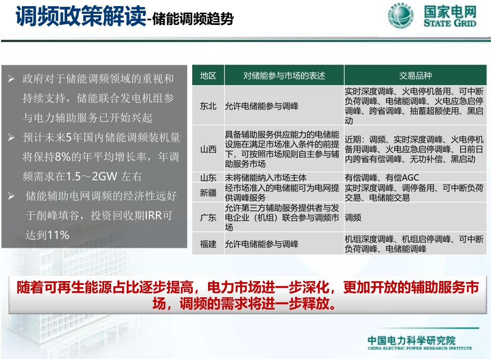 這幾年調(diào)頻這么火熱,和國家能源局的這兩個(gè)政策是相關(guān)的,這個(gè)政策明確給了我們儲能一個(gè)名分,雖說沒有具體的數(shù)字,但是給我們儲能定位給了明確定義。首先在三北地區(qū),他規(guī)定每個(gè)可以干5個(gè)左右的調(diào)頻電站,首先在量級上有個(gè)說法。再一個(gè),儲能或者火電機(jī)組聯(lián)合起來這是可以的。還有一種是獨(dú)立運(yùn)行也是合法合規(guī)的。2017年頒布的也是針對這個(gè)進(jìn)行了強(qiáng)化,鼓勵(lì)儲能設(shè)備做一些相應(yīng)的服務(wù),并且要求各區(qū)域完善各自的細(xì)則。在這兩個(gè)導(dǎo)則下,我們西北和華北做了大量的工作。