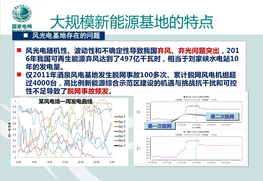 這是我們的資源屬性風(fēng)電的特點(diǎn),風(fēng)電最主要的帶是沿著北方的一線拉過去的,其中絕大部分是其中在蒙古高原及其邊遠(yuǎn)地帶。在發(fā)展過程中,這幾年稍微有點(diǎn)變化,2015年,風(fēng)電80%集中在三北地區(qū),西部地區(qū)集中著60%以上的光伏。未來,我們的資源和稟賦決定了這種發(fā)展將是我們主要的發(fā)展趨勢(shì)。在這種發(fā)展模式下形成了大規(guī)模集中開發(fā)、遠(yuǎn)距離送出的發(fā)展態(tài)勢(shì)。我以九泉新能源基地為例,在九泉這樣1000公里以外的地方,建設(shè)著千萬千瓦的風(fēng)電基地,現(xiàn)在大概有1500多萬千瓦的風(fēng)光電集中在區(qū)域內(nèi)。這種發(fā)展模式在全世界是獨(dú)有的,也就是距離負(fù)荷中心1000公里,像北京到南京的直線距離,蘭州到太原的空中直線距離也是1000多米。而且1500萬千瓦已經(jīng)遠(yuǎn)遠(yuǎn)超過了歐洲很多國(guó)家,比如丹麥的風(fēng)電和光伏裝機(jī)容量加起來只有600萬千瓦。所以這個(gè)規(guī)模已經(jīng)是相當(dāng)大了。風(fēng)電本身的隨機(jī)波動(dòng)性導(dǎo)致輸電難以控制,運(yùn)行控制和系統(tǒng)穩(wěn)定都面臨巨大的挑戰(zhàn),并且存在很大的問題,其中也包括后面分析的調(diào)峰調(diào)頻方面的問題。