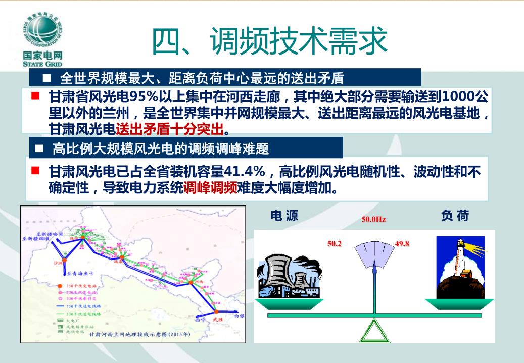甘肅個(gè)別時(shí)段的理論出力已經(jīng)達(dá)到用電負(fù)荷的70%以上,理論出力的值甚至達(dá)到90%,甚至100%的水平。這個(gè)時(shí)候,如果電力系統(tǒng)可再生能源的發(fā)展使得整個(gè)電力系統(tǒng)常規(guī)電源的調(diào)頻能力不足,導(dǎo)致調(diào)頻的矛盾日益突出,需要用其他的手段來參與。而且在緊急狀態(tài)下,特別是事故狀態(tài)下的調(diào)頻需求,更是很難替代,急需一種在緊急狀態(tài)下頻率穩(wěn)定支撐的有效的元素。