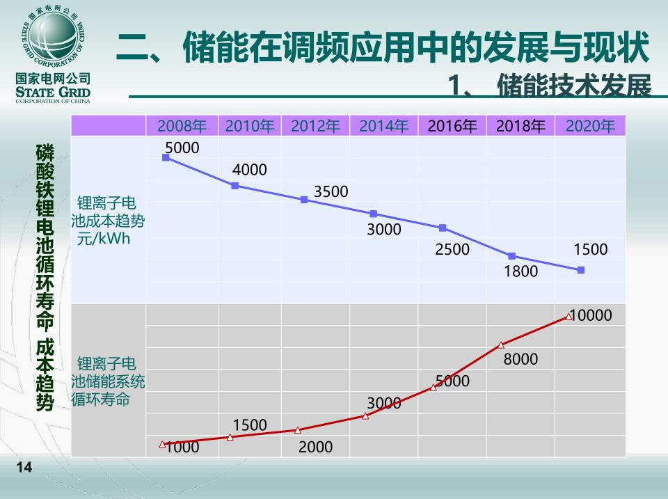 在儲能技術(shù)發(fā)展方面,大家比我掌握得數(shù)據(jù)更精確。儲能系統(tǒng)從成本在逐年下降,循環(huán)壽命在逐年上升,尤其是以鋰電池為代表,發(fā)展比較迅猛。其他的鉛炭、液流的成本也是呈下降趨勢。