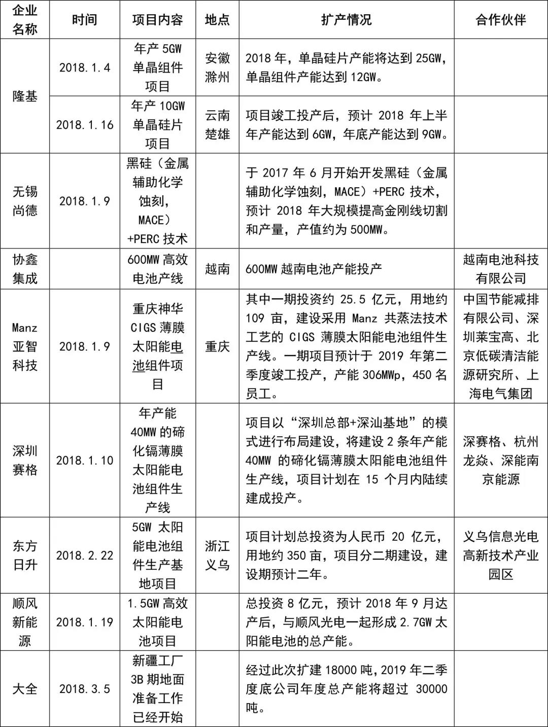 表 1 2018年1-2月國內(nèi)部分光伏企業(yè)擴產(chǎn)情況