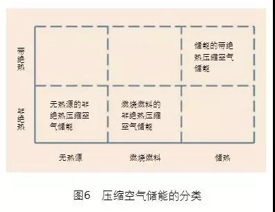根據(jù)壓縮空氣儲能的絕熱方式,可以分為兩種:非絕熱壓縮空氣儲能、帶絕熱壓縮空氣儲能。同時根據(jù)壓縮空氣儲能的熱源不同,非絕熱壓縮空氣儲能可以分為無熱源的非絕熱壓縮空氣儲能、燃燒燃料的非絕熱壓縮空氣儲能,帶絕熱壓縮空氣儲能可以分為外來熱源的帶絕熱壓縮空氣儲能、壓縮熱源的帶絕熱壓縮空氣儲能(見圖6)。
