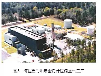 第二座是1991年投入商業(yè)運行的美國Alabama州的McIntosh壓縮空氣儲能電站(見圖5)。儲能電站壓縮機組功率為50MW,發(fā)電功率為110MW。儲氣洞穴在地下450m,總?cè)莘e為5.6×105m3,壓縮空氣儲氣壓力為7.5MPa??梢詫崿F(xiàn)連續(xù)41h空氣壓縮和26h發(fā)電,機組從啟動到滿負荷約需9min。該電站由Alabama州電力公司的能源控制中心進行遠距離自動控制。實際運行效率約為54%。