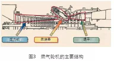 燃氣輪機裝置由壓氣機、燃燒器(或叫燃燒室)和透平3個主要部分組成(見圖3)。燃氣輪機的工作原理為:葉輪式壓氣機從外部吸收空氣,壓縮后送入燃燒器,同時燃料(氣體或液體燃料)也噴入燃燒室與高溫壓縮空氣混合,在定壓下進行燃燒。生成的高溫高壓煙氣進入透平膨脹做功,推動動力葉片高速旋轉(zhuǎn),同時驅(qū)動壓氣機旋轉(zhuǎn)增壓空氣,燃氣輪機裝置中約2/3功率用于驅(qū)動壓氣機。
