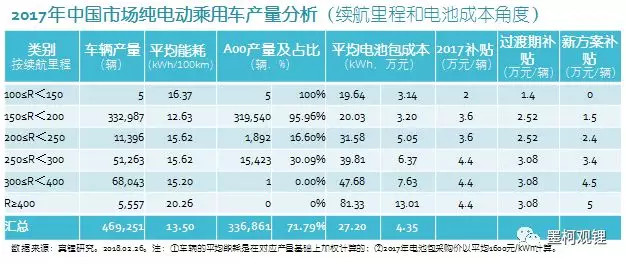 上表是真鋰研究統(tǒng)計的從續(xù)航里程角度看的2017年生產(chǎn)的純電動乘用車的情況。這個表其實向我們提供了很多信息。比如,續(xù)航里程150km以下產(chǎn)品的平均能耗是16.37kWh/100km,而150-200km產(chǎn)品則一下子降到了12.63 kWh/100km,為什么會有這種現(xiàn)象?從產(chǎn)量看,前者只生產(chǎn)了5輛,而后者生產(chǎn)了33.3萬輛,占全部純電動乘用車產(chǎn)量的71%。2017年大量的產(chǎn)品集中在150-200km這個檔次,一方面表明該檔的補貼政策相對來說最為有利可圖(上表也體現(xiàn)了這一點),另一方面,這類車的96%是微型A00級產(chǎn)品,由于A00級產(chǎn)品的整備質(zhì)量較輕,安全要求也相對較低,加上該類產(chǎn)品的生產(chǎn)廠商數(shù)量眾多,大家群策群力去探索安全的邊界以獲取更高的收益,平均能耗較150km以下類別顯著降低就是這種極致探索的結(jié)果。
