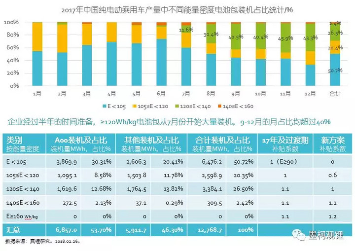 從上面的圖表可以看到,2017年電池包能量密度在105Wh/kg以下的車輛的鋰電裝機占比高達50.7%,超過了一半,如果新政在2017年實施的話,這部分裝機量對應(yīng)的車輛是無法獲得一分錢補貼的;而能夠獲得基礎(chǔ)系數(shù)1以上的占比也只有28.92%。鮮明體現(xiàn)了新政在能量密度方面的大躍進。雖然從月份進展來看,去年后4個月的裝機表現(xiàn)使得新政的推出也有它的合理性,但是,后4個月的車輛目前為止并沒有多少上路的實證數(shù)據(jù),安全系數(shù)是否足夠尚未可知,這種情況下就迫不及待進一步大幅提升能量密度要求,可能欠妥。