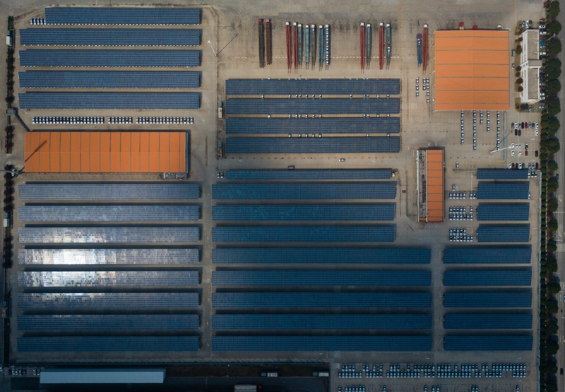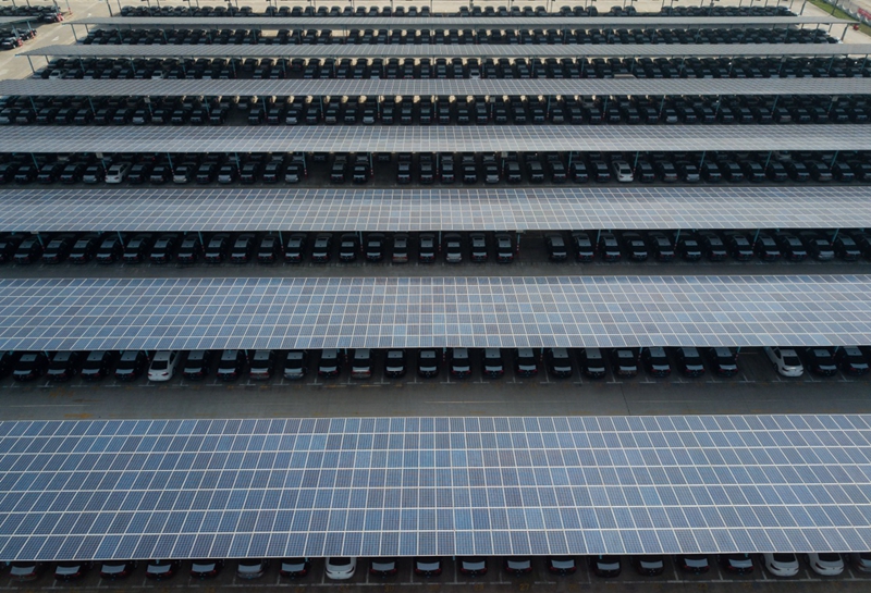 圖為3月26日拍攝的上海大眾汽車南京分公司廠內(nèi)的光伏車棚(無人機(jī)航拍)。