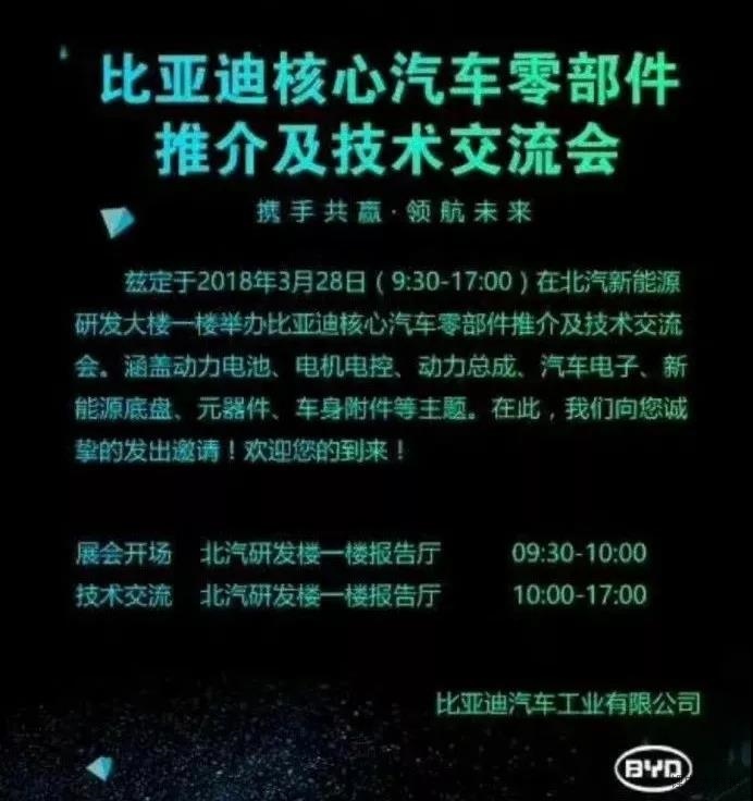 有消息稱,比亞迪將在北汽新能源研發(fā)大樓舉辦比亞迪核心汽車零部件推介及技術(shù)交流會,其中竟涵蓋了動力電池、電機電控、動力總成、汽車電子、新能源底盤、元器件、車身附件等主題。這個交流會的地點以及內(nèi)容都相當(dāng)耐人尋味。