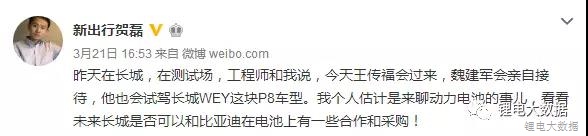 2018年3月20日,有媒體報道稱,比亞迪董事長王傳福到訪保定,長城老總魏建軍親自接待,并且還試駕了長城旗下的WEY P8新能源SUV。長城總裁魏建軍以自己姓氏為品牌,由前寶馬設(shè)計師傾力打造的打造“WEY”品牌,是長城決戰(zhàn)在新能源汽車未來的重磅武器。