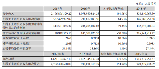 2017年,受國家對(duì)新能源汽車發(fā)展政策以及下游鋰電池生產(chǎn)企業(yè),尤其是國內(nèi)、國際高端鋰電池生產(chǎn)企業(yè)投資速度加快、規(guī)模持續(xù)擴(kuò)大趨勢(shì)的影響,先導(dǎo)智能鋰電設(shè)備業(yè)務(wù)增長明顯,這是先導(dǎo)智能業(yè)績?cè)鲩L的主要?jiǎng)右?。?017年全年的報(bào)告期內(nèi)實(shí)現(xiàn)營業(yè)收入217,689.53萬元,同比增長101.75%;歸屬于上市公司股東的凈利潤53,750.00萬元,同比增長84.93%;鋰電池生產(chǎn)設(shè)備收入占比83.72%,得益于國家對(duì)新能源行業(yè)的大力支持,鋰電池生產(chǎn)設(shè)備行業(yè)在未來3-5年還會(huì)高速發(fā)展。