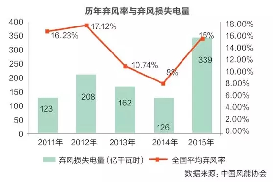 2015年我國(guó)棄風(fēng)量達(dá)339億千瓦時(shí)再創(chuàng)新高,平均棄風(fēng)率達(dá)到15%,“三北”地區(qū)棄風(fēng)電量占全國(guó)總棄風(fēng)電量的99.9%。國(guó)家大力打造“風(fēng)電三峽”主力軍的甘肅,棄風(fēng)率接近40%,居全國(guó)首位。因“遭受區(qū)域性整體限電”,多家風(fēng)電企業(yè)陷入凈虧損。據(jù)統(tǒng)計(jì),當(dāng)年棄風(fēng)電量對(duì)風(fēng)能企業(yè)造成的直接經(jīng)濟(jì)損失達(dá)183億元。金風(fēng)科技位于新疆某處風(fēng)電場(chǎng)的棄風(fēng)率達(dá)到40%以上,僅一家電場(chǎng)的損失就接近5億元。