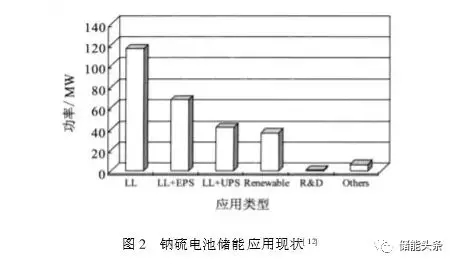 另外鈉硫電池在輸配電系統(tǒng)的有功、無功支持及多功能電能儲存系統(tǒng)中也有良好的應用前景。1992年~2007年,全球鈉硫電池儲能應用共計196個項目,安裝容量270MW。其中,各種應用所占的比例如圖2所示,用于LL的安裝容量最大,有接近120MW。用于LL+EPS和LL+UPS模式的總安裝容量有100MW左右。用于新能源領域的不到40MW。用于科研和其他應用的只有一小部分。