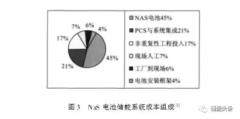 美國NaS電池項目中的價格組成如圖3所示,其中鈉硫電池的成本占到了總成本的45%。