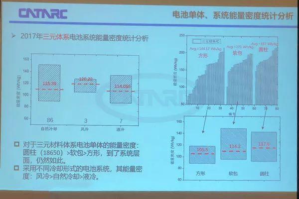 王芳提到,冷卻方式方面,中汽中心共比較了96款車型的冷卻方式,根據(jù)所對比出的數(shù)據(jù)得出的結論不是很準確。因為在所有檢測的96款車型中只有3款使用了風冷,7款使用了液冷。通過數(shù)據(jù)對比發(fā)現(xiàn),使用風冷的動力電池能量密度最高,其次是自然冷,液冷最低,她解釋道:這其實因為風冷數(shù)據(jù)過少,若是相同的電池系統(tǒng),應該是自然冷卻最高,然后是風冷,其次是液冷,因為風冷和液冷相比自然冷卻,需要的額外零部件增加了電池系統(tǒng)重量,并且在使用中需要額外消耗電力。