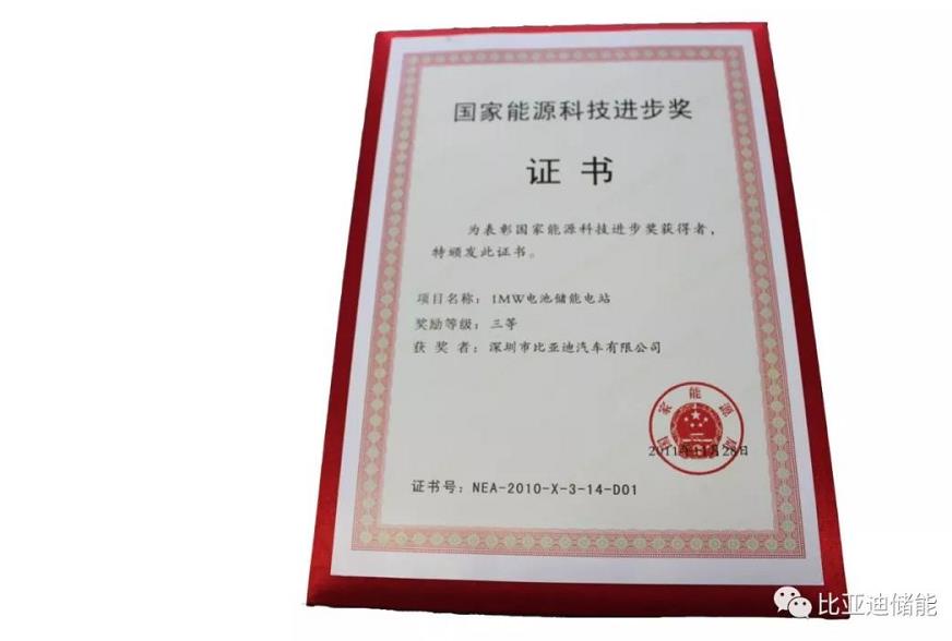 ?比亞迪1MW儲(chǔ)能電站在國家能源科技進(jìn)步獎(jiǎng)申報(bào)中榮獲三等獎(jiǎng)。