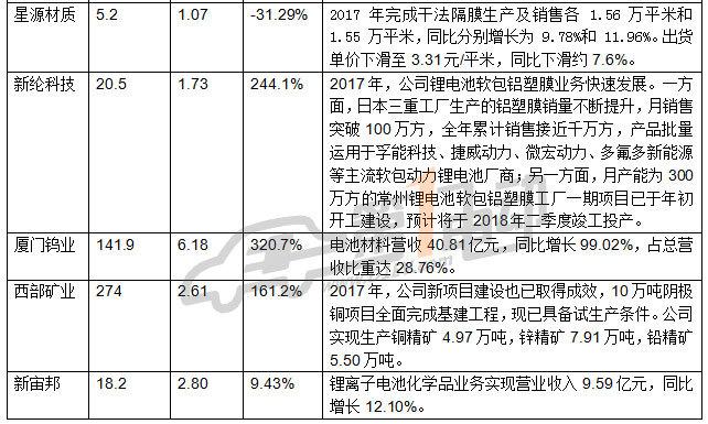 動力鋰電池材料業(yè)務(wù)方面,2017年,杉杉股份鋰電池材料業(yè)務(wù)實(shí)現(xiàn)主營業(yè)務(wù)收入60.4億元,同比增長47.37%。廈門鎢業(yè)電池材料營收40.81億元,同比增長99.02%,占總營收比重達(dá)28.76%。當(dāng)升科技鋰電材料業(yè)務(wù)營收19.29億元,同比增長89.41%,銷量為9764噸,同比增長21.73%。滄州明珠鋰離子電池隔膜產(chǎn)品實(shí)現(xiàn)主營業(yè)務(wù)收入為4.3億元,同比增長14.34%。勝利精密隔膜業(yè)務(wù)2017年實(shí)現(xiàn)營業(yè)收入4.74億元,同比增長76.27%。