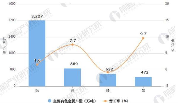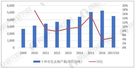 據(jù)前瞻產(chǎn)業(yè)產(chǎn)業(yè)院發(fā)布的《有色金屬行業(yè)市場前瞻與投資戰(zhàn)略規(guī)劃分析報告》數(shù)據(jù)顯示,2017年,十種有色金屬產(chǎn)量5378萬噸,同比增長3.0%。其中,銅、鋁、鉛、鋅產(chǎn)量分別為889萬噸、3227萬噸、472萬噸、622萬噸,同比增長7.7%、1.6%、9.7%、-0.7%。規(guī)模以上有色金屬工業(yè)增加值累計同比增長0.7%。