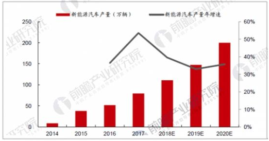 據(jù)前瞻產(chǎn)業(yè)研究院發(fā)布的《新能源汽車行業(yè)戰(zhàn)略規(guī)劃和企業(yè)戰(zhàn)略咨詢報告》數(shù)據(jù)顯示,2017年,我國新能源汽車產(chǎn)量為79.4萬輛,同比增長53.8%,占當年汽車行業(yè)總產(chǎn)量(2,902 萬輛)的比例卻僅為2.74%。新能源汽車市場尚處于發(fā)展早期,未來受益政策推動、科技創(chuàng)新,產(chǎn)業(yè)快速成長的勢頭未來仍將持續(xù)十年甚至幾十年。預計,2018~2020年,我國新能源汽車產(chǎn)量將分別達到110.8萬輛、147.4萬輛、200萬輛,保持快速增長勢頭。