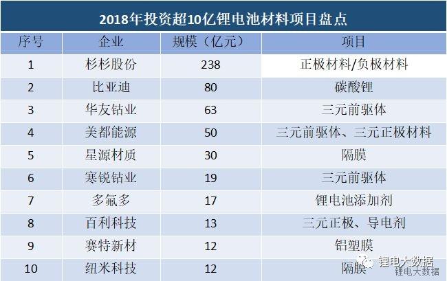 行業(yè)分析認(rèn)為2018年將是三元電池量產(chǎn)元年,相對應(yīng),各大材料企業(yè)也紛紛加碼三元材料,不斷擴充產(chǎn)能,在上列十大超10億的項目中,多一半涉及三元正極材料,包括杉杉股份、比亞迪、華友鈷業(yè)、美都能源、寒銳鈷業(yè)和百利科技。