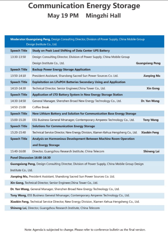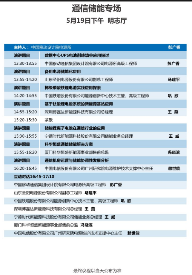 以下為通信儲(chǔ)能專場(chǎng)大會(huì)議程表。