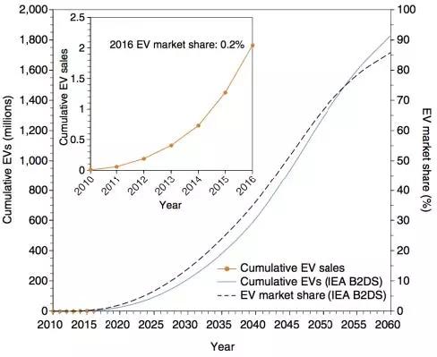 圖1. 國際能源署“高于2攝氏度方案”中提出的電動汽車銷售和電動汽車市場共享演進圖