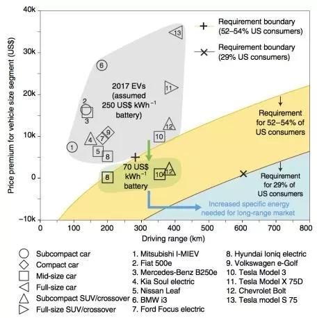 發(fā)展新能源汽車是各國的國家戰(zhàn)略抉擇,但是在減緩氣候變暖的大格局下,電動汽車的發(fā)展仍然不盡如人意,如圖1所示。鋰離子電池是當前最具實用價值的電動汽車動力來源,然而它的低能量密度和高成本遠遠不能滿足未來的電動車市場需求。例如在2016年的一項調(diào)查中發(fā)現(xiàn),美國消費者中超過一半的人難以接受購買續(xù)航里程280公里以下且超過普通燃油車價格5000美元的電動汽車。令人遺憾的是,圖2表明目前市場上仍未出現(xiàn)完全滿足如上需求的電動車。雖然鋰離子電池包預計2030至2040年能降至70美元/千瓦時,但即使是最具性價比的三款電動汽車仍有三成左右的消費者不愿意購買。除了價格因素,鋰離子電池包的安全性和快充能力仍然需要進一步提高以獲得市場更為廣泛的接納。