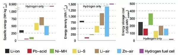 圖3.可充電電池與氫燃料重量能量密度,體積能量密度以及能量存儲系統(tǒng)的成本