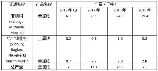 2018年一季度,嘉能可自有鈷資源產量為7千噸金屬鈷,同比上漲11%。 一季度非洲銅項目鈷產量為6.1千噸,同比上漲7%,增量500噸主要來自于Katanga,該礦山于2018年3月按期交付第一批鈷產品。綜合鎳業(yè)務下鈷產量為0.2千噸,同比上漲100%,若包括第三方供料,該項目金屬鈷產量為1千噸,同比上漲25%。Murrin Murrin項目金屬鈷產量為0.7千噸,同比上漲40%,主要是去年同期相關冶煉廠檢修產量不足。